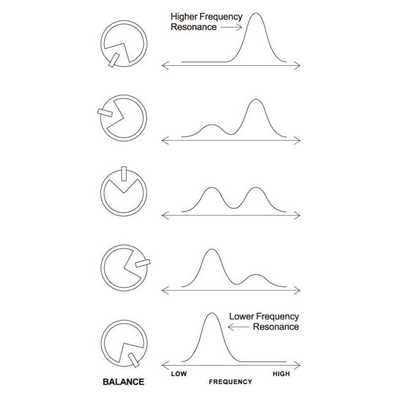 二つのピークポイント周波数帯それぞれのミックス・レベル・バランスを調節します。高音域側は従来からの代表的なワウペダルの可変範囲に近く、低音域側はカスタム・ワウペダルや、シグネチャー・ワウペダル等で採用される可変範囲に近いものです。バランス・コントロールはこの二つの周波数帯のミックス・レベル・バランスを調整します。ノブが 0 の位置(反時計回りに振り切った状態)では、高音域側のみがブーストされ、そこから時計回りに回すにつれて徐々に低音域側がブーストされていきます。12 時の位置で、高音域側と低音域側が同レベルになり、フルの位置(時計回りに振り切った状態)では、低音域側のみブーストされます。