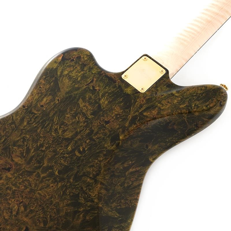 「バール (Burl)」とは、樹木が生育する過程で幹の根元にできたコブの部分のことを指します。すべての木々に現れるわけではなく、その個性的な見た目と希少性から貴重な木材として取引されています。本モデルはバール杢の出たメイプル材を贅沢にも1ピースで採用。ボディトップからサイド、バックにかけて全面に広がるバールの杢目を存分にご堪能いただけます。
