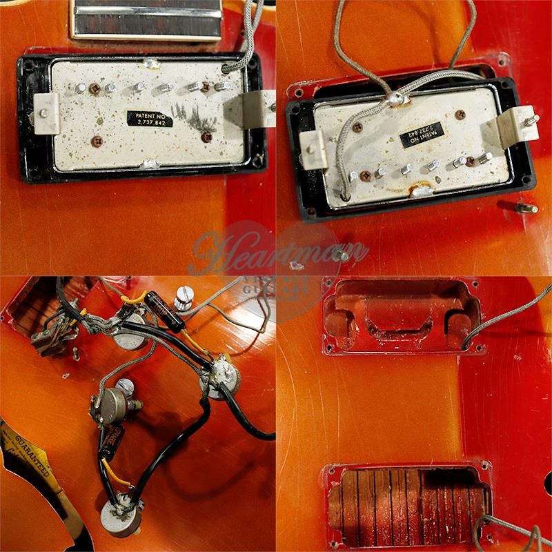 全体重量は約3.7kg。ボディ材はメイプル、センターブロックを備えた約16インチほどの幅を持つセミホロー構造はおなじみ。レアなスパークルバーガンディカラーが褪色し、メタリックなオレンジに渋く仕上がっております。全体的にウェザーチェック、打痕等キズ部分、金属パーツのくすみはみられるものの、塗装の艶自体は良好で比較的きれいなコンディションをキープしております。オリジナルのブランコテールピースからビグスビーB-6トレモロユニットにコンバートされているのが注目ポイントでしょう。その他アウトプットジャックが交換されています。