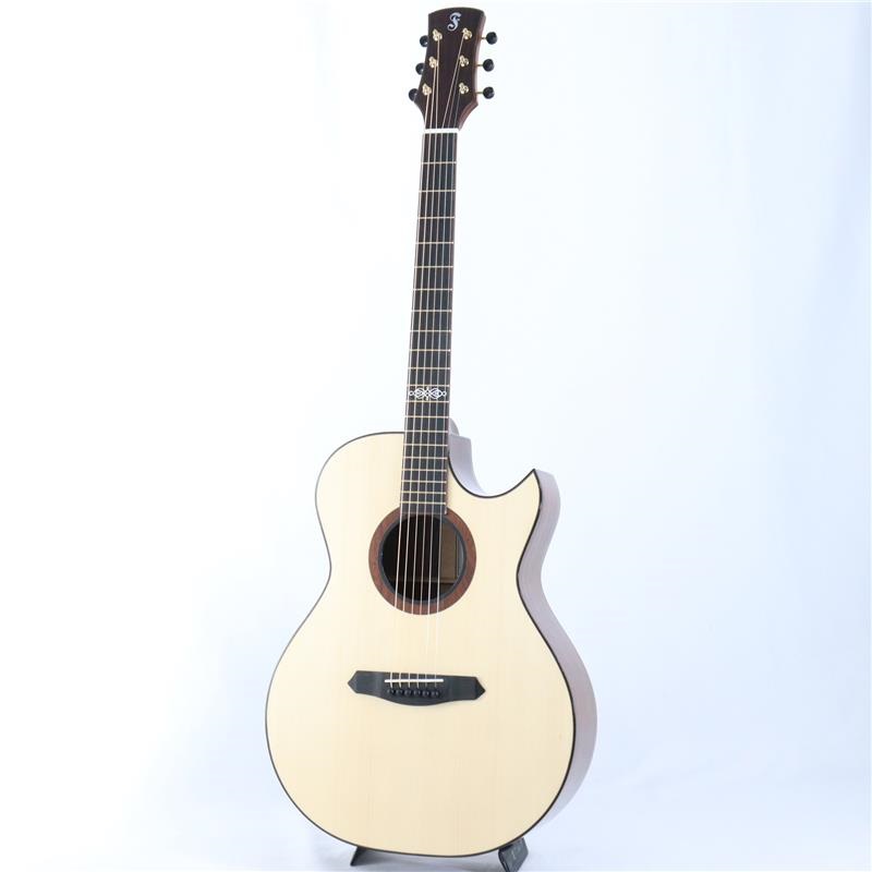 Fonzo GuitarファクトリーラインのV-33シリーズ。このV-301はミニマルデザインでありながら、高級感溢れるオールソリッドモデルです。トップ材に軽量で音の立ち上がりに優れたEngelmann Spruce、バック&サイドに美しい杢目が特徴的なSantos Rosewoodを採用。オリジナルのPremium Small Jumboシェイプは小さ過ぎず、大き過ぎないベストな形状を模索し、プレイヤーの負担を軽減。低音から高音までバランス良く鳴らすことが出来る、プレイヤー目線のシリーズ。