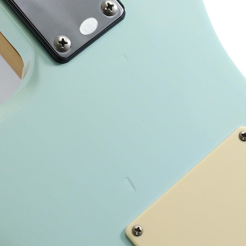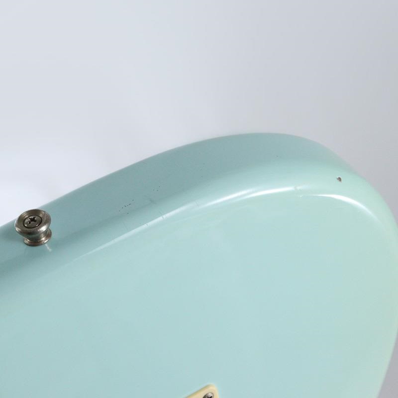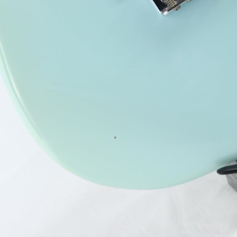 電気系統は良好となっておりますが、ボディ、ネック、指板など全体的に打痕やスリ傷や細かな塗装欠けがあり、ネックと指板は7フレット付近まで使用に伴う細かな打痕や指板エンドの削れ、塗装のテカリが見受けられます。また元々ソニックブルー系カラーですが経年変化により塗装が若干緑がかった色に変色しています。