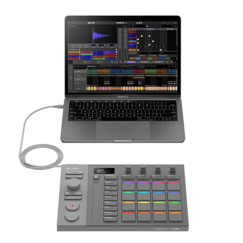 SLABはA4サイズ以下の薄型コンパクトな筐体で、自宅やカフェなどどこでも快適なスタジオ環境を提供します。2トーングレーカラーはどこへでも持ち出したくなる軽やかな印象を与えるとともに、直感的な操作のための機能グルーピングを実現。AlphaTheta製DJ機器でおなじみの円形PLAY/RECボタンや、Serato StudioやSerato Sampleのサンプルクリップを想起させるイルミネーションバーなど、細部まで配慮されたUIが制作と演奏をサポートします。さらに、本体カラーに合わせたグレーのUSB Type-Cケーブルを同梱。L字型端子により、省スペース環境でもスマートで柔軟な設置を可能にしています。