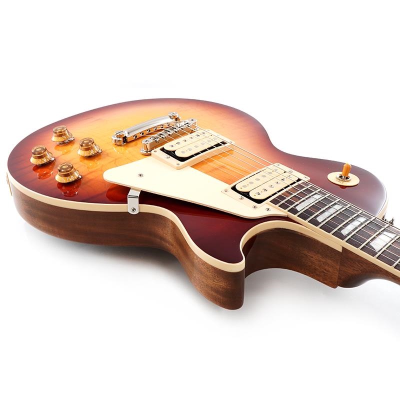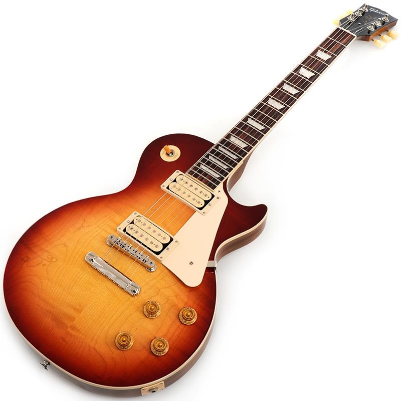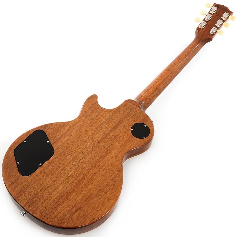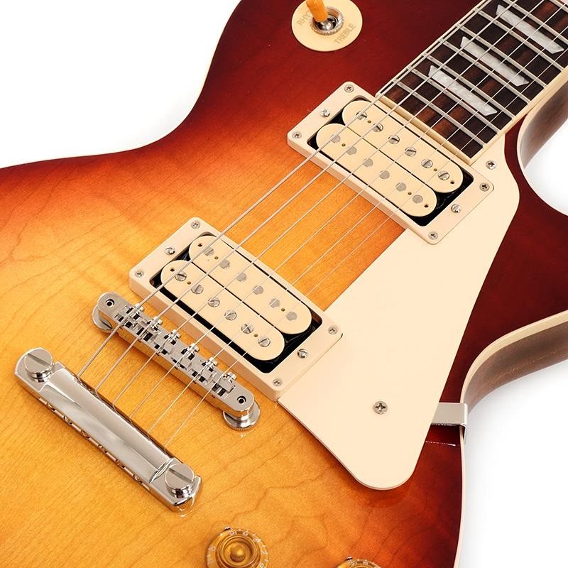 このような特色が加えられながらも、Les Paul Standard 50sの広く愛される基本仕様に変更はなく、ウェイト・リリーフ無しのソリッド・マホガニーボディ、AAグレードのフィギュアド・メイプル・トップ、丸みのある50年代スタイルのマホガニー・ネック、ローズウッド指板、22フレット仕様のミディアムジャンボフレット、トラペゾイド・インレイを擁しています。また、ABR-1 Tune-O-Maticブリッジ、アルミ製ストップバー・テイルピース、キーストーンボタン仕様のVintage Deluxeチューナー、ダイヤルポインター付きのエイジド・ゴールド・トップハット・ノブを搭載。