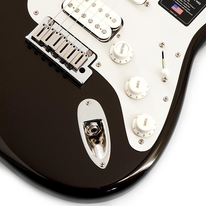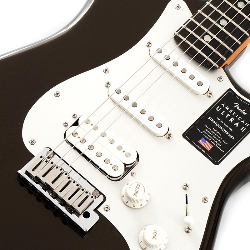 American Ultra II Stratocaster HSSは、厳選されたアルダーボディに深めのボディコンターが施されています。クォーターソーンメイプルネックはModern Dネックシェイプで、ネックバックは触り心地の良いUltra Satinフィニッシュで仕上げられています。10?14インチコンパウンドラジアのエボニーまたはクォーターソーンメイプル指板は、エッジを丁寧にロールオフ処理したUltraロールドエッジが採用されており、ミディアムジャンボフレット、蓄光式Luminlayサイドドット、Graph Tech TUSQナットを装備しています。テーパードネックヒールと深いボディコンターにより、ハイポジションへの容易なアクセスが可能です。