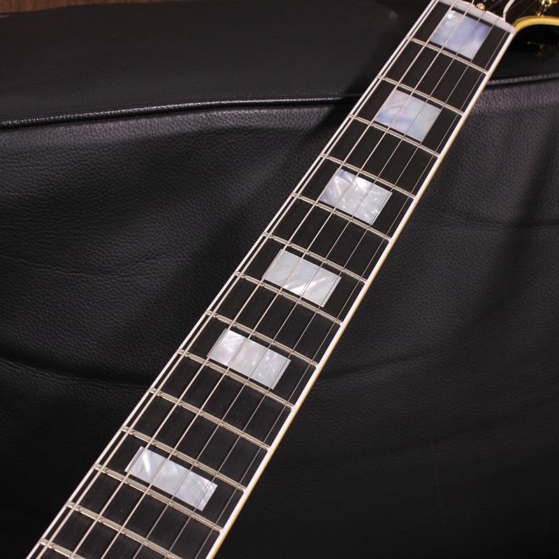 メイプル材を使用しない1ピースマホガニーボディにオールブラックのフィニッシュに加え、黒々としたエボニー指板やヘッドのダイヤモンドインレイ、非常に手間が掛かるマルチバインディングの高級感が堪りません!ネックグリップは現在のCustom Shopのラインナップの中では厚めで丸みがあるグリップですが、極端に「太い!」と感じるほどではないように思います。Gold Topに先んじてABR-1ブリッジが搭載されている点も見逃せませんね。