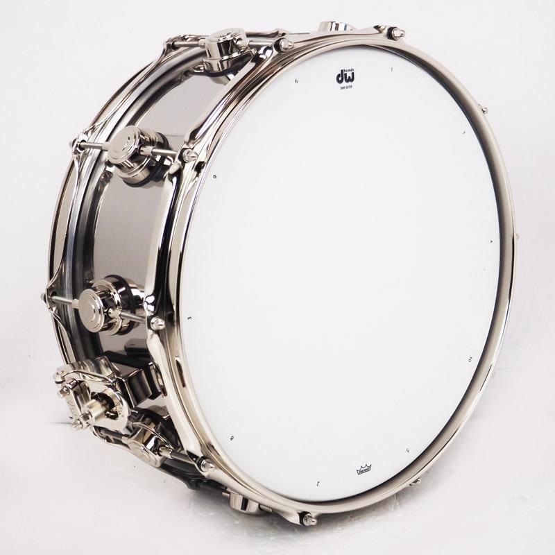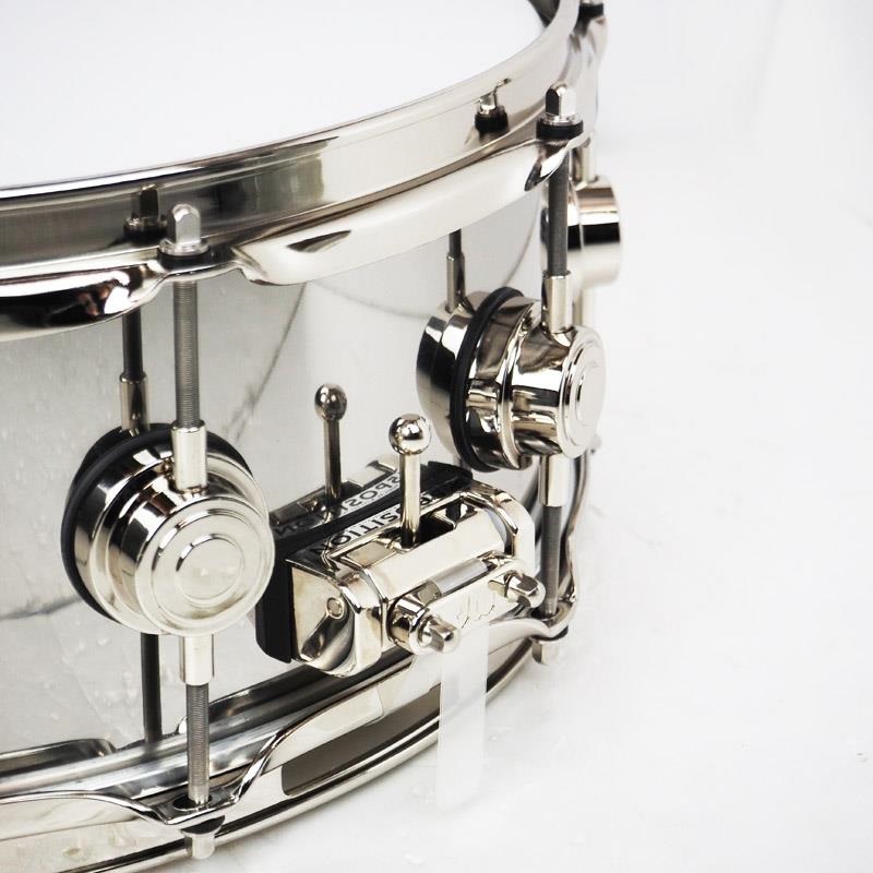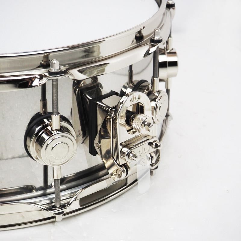 開放的な鳴りと鮮明なアタックをもたらす3mm厚のフープやラグ、ストレイナーなど、ハードウェアはニッケルメッキ仕上げとなっており、ポリッシュド・フィニッシュされた光沢のある滑らかなシェルと見事にマッチします。
