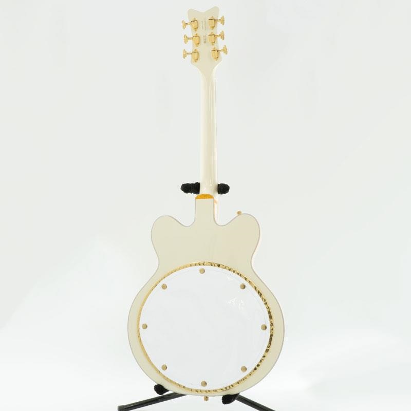 ゴールドハードウェア、Grover Imperialダイキャストチューニングマシン、ジュエル入りGアローコントロールノブ、ホワイトネックバインディング、Fホール、厚手のゴールドGretschロゴ入り・ヴィンテージプレキシピックガードが特徴的な本モデルは、Gretschのスタイリングを体現しています。