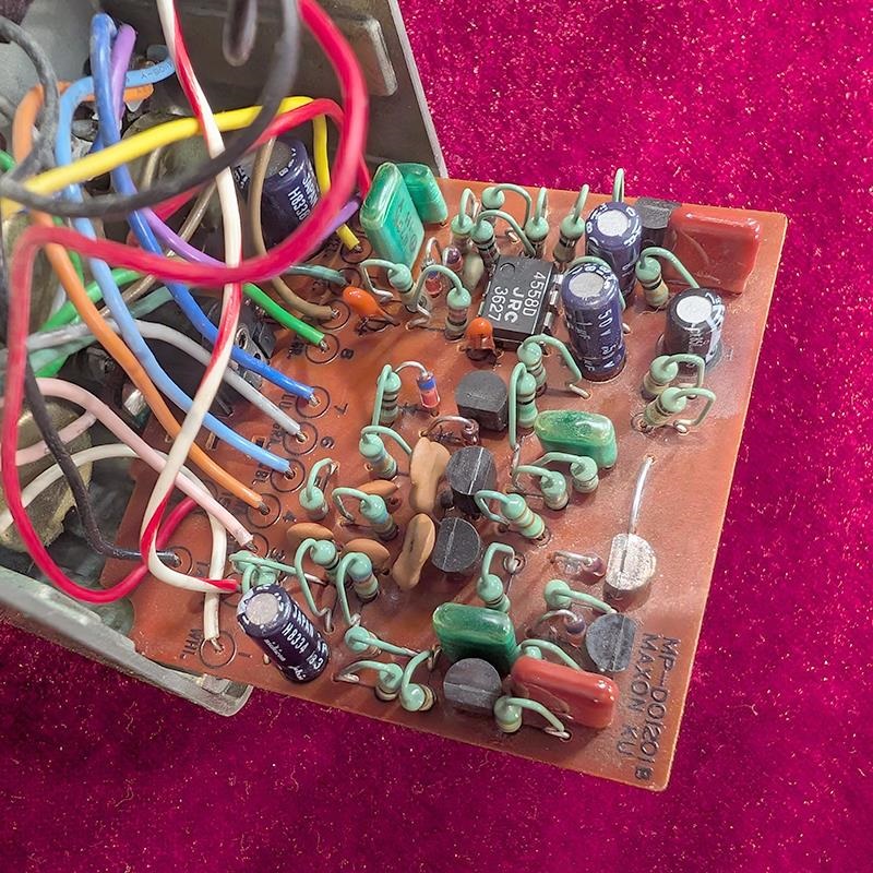 オペアンプICは艶ありJRC4558Dを搭載。前後の時期に採用されるオペアンプであるJRC2043DDやTA75558P等と比較すると、豊かなローミッドやハリのあるトレブルに加え、倍音域も豊かな心地よいオーバードライヴ感が魅力です。