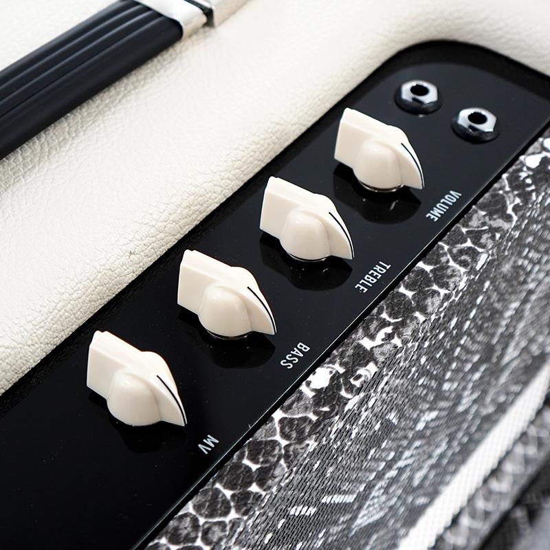コントロール部はVolume,Treble ,Bass,MasterVolumeとシンプルにまとめられております。パワー部に使用される6V6×2(11W)の力強いブルージーなトーンが、ギターサウンドにコシのあるレンジを求められる最新音楽シーンにベストマッチ致します。また、VolumeポットをPullする事で、Mid/Gain Boostさせる事も可能です。