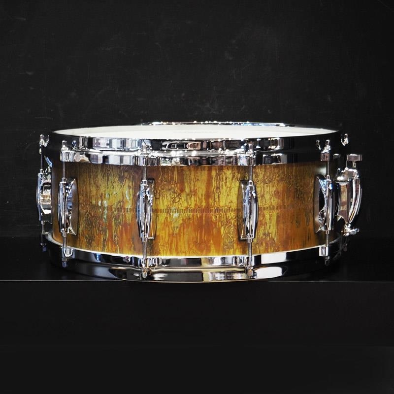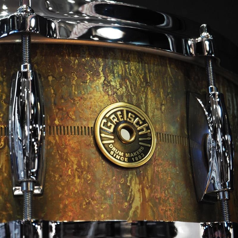 試行錯誤の上、シェルは14×5.5インチ/2mm厚のアンティーク調ブラスシェルに、45度ベアリングエッジという仕様へ辿りつきました。また、キースの志向から、前に出るスネアサウンドやアタックよりも、ダイナミクスとピッチレンジを向上させるために20本スネアワイヤーを、ヘッドにはPermatone Coatedヘッドを標準装備としました。4mm厚Gretschダイキャストフープ、ストレイナーはLightning Throw-offを採用しています。このブラスシェルは製造・エイジング技術により、1台1台の仕上げ、色合いや艶、全体的な外観が絶妙に異なります。