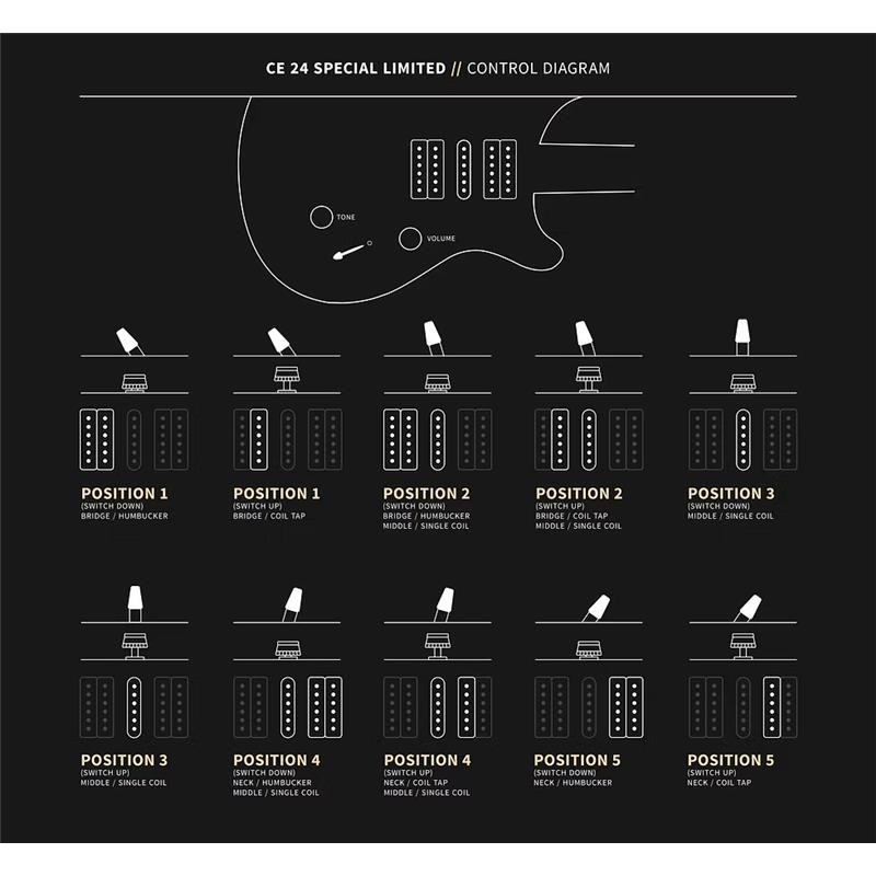 PRS CE 24 Special Limited Editionは、CE 24をベースにハムバッカー/シングルコイル/ハムバッカーのピックアップ・レイアウトを採用した特別仕様となるモデルです。PRSではお馴染みの24フレット & 25インチ・スケールを備え、汎用性に優れたCE 24に、トレブルとベース・ポジションにPRS 85/15ピックアップを、そしてミドル・ポジションにPRS NS-01 シングルコイル・ピックアップを搭載。5wayブレード・スイッチとの組み合わせにより、幅広いジャンルに対応する多彩なサウンドを創出します。