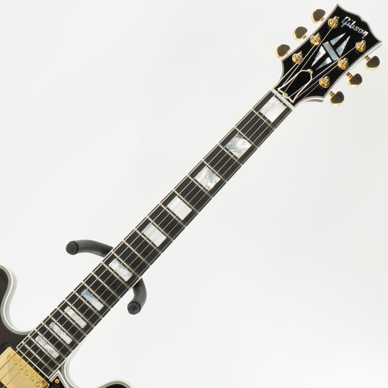 「ES」シリーズもギブソン・ソリッド・シリーズの流れを組むラインナップ構成がされており、当機はLes Paulで言うところのアップグレード・モデル「カスタム」的な位置付けがされ、「カスタム」特有のスペックを採用している点が特徴となっております。スプリット・ダイアモンド・インレイが施されたラージマルチ・プライ・セル・バインディング、ゴールドパーツの採用等、上位機種らしい豪華さを兼ね備えており、レギュラーESシリーズに比べても圧倒的に重厚な高級感を醸し出しております。