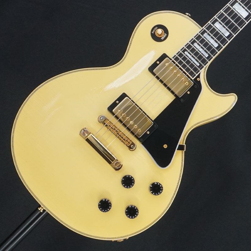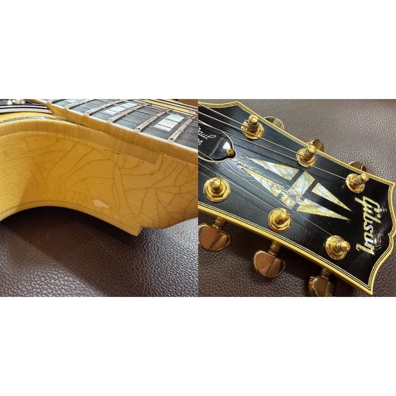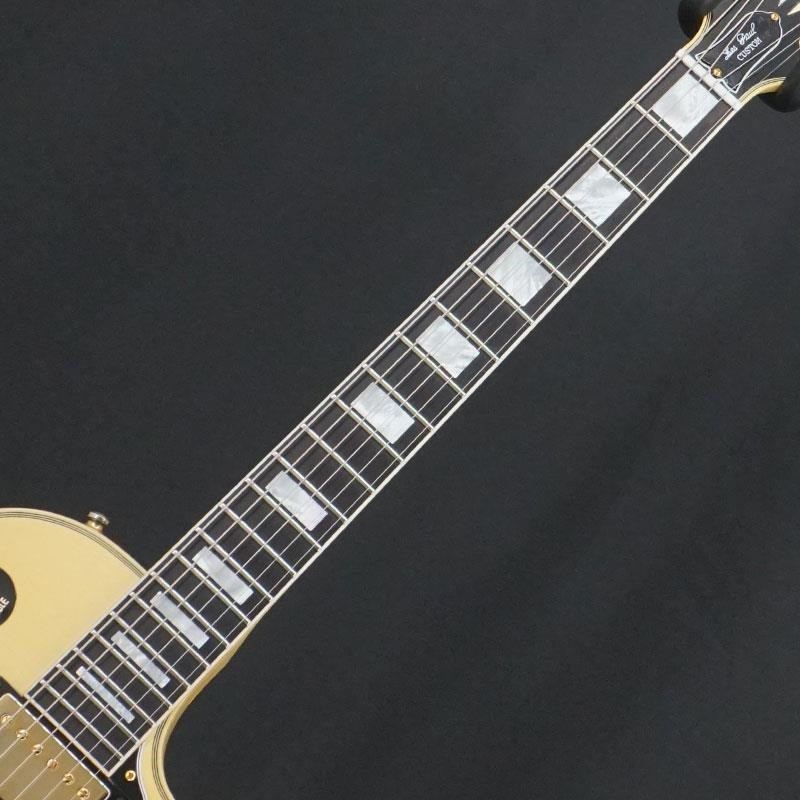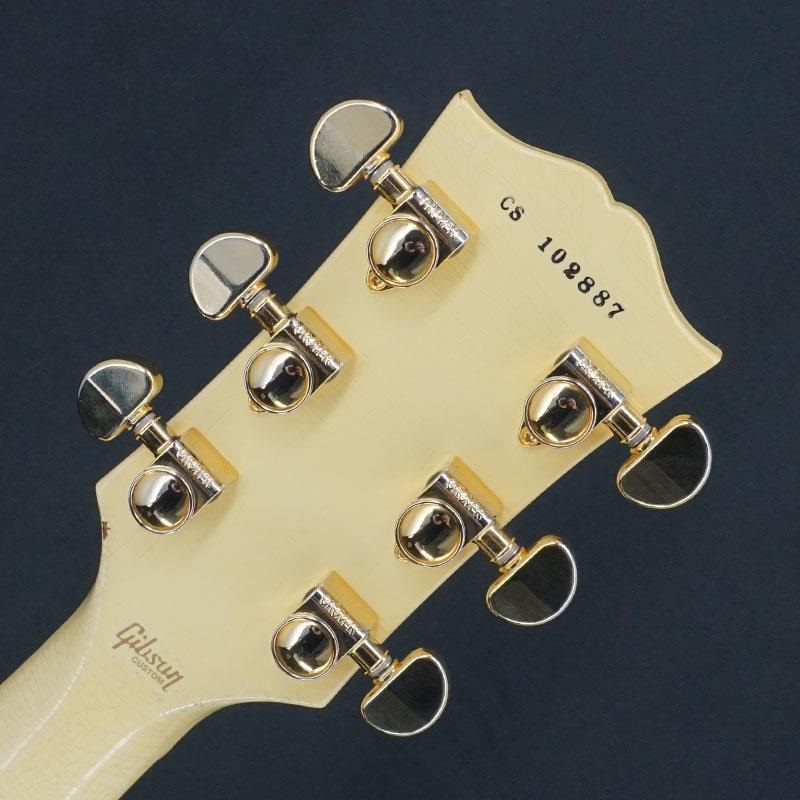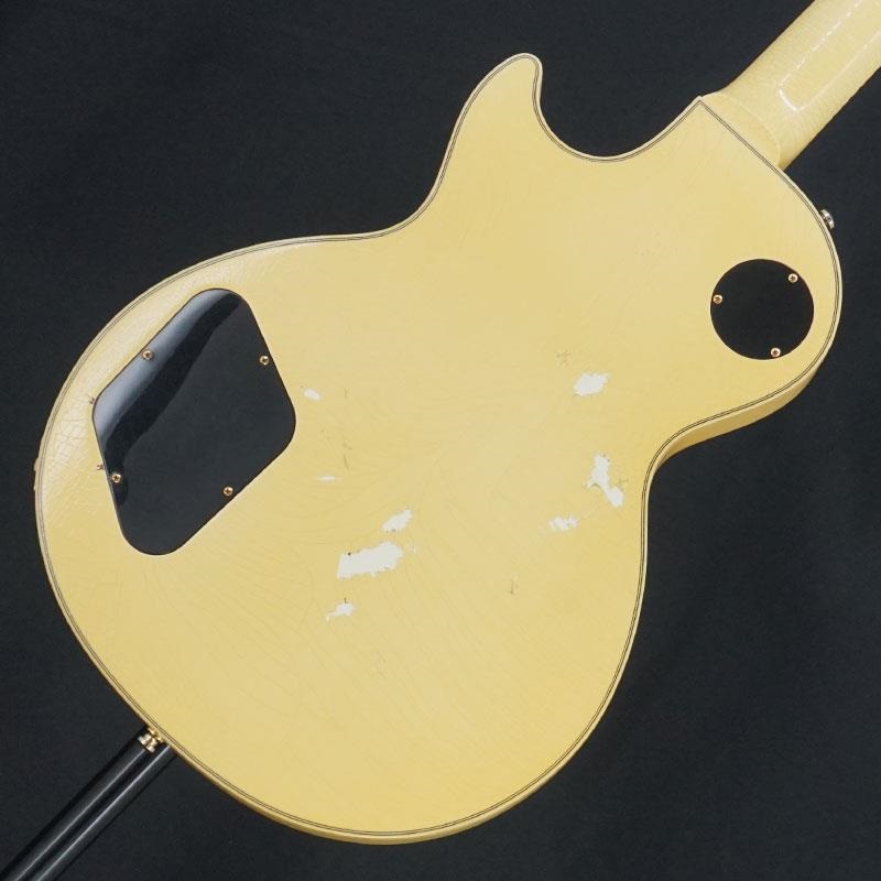 本機は4段階で設けられたエイジングレベルで最もダメージが軽微なコンディションの「Ultra Light Aged」が施されたLes Paul Custom です。Ultra Light Agedは長年ケースに入れて大事に保管されていたかのような、最小限のダメージに抑えられた経年変化の風合いが自然に表現され、穏やかなウェザーチェックや打ち傷等の加工が施されております。エイジド加工にとどまらず、経年変化により退色した様子を再現した「Heavy Antique White」のボディカラーにより、更なる風格を纏った一本となっております。
