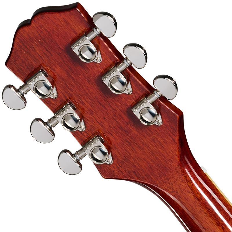 指板にはローズウッドを採用し、パーロイド・トラペゾイド・インレイと22本のミディアム・ジャンボ・フレットを備えています。60sスタイルのカラマズー・ヘッドストックには、Grover RotomaticチューナーとGraph Techナットを搭載し、安定したチューニング性能を実現しています。ブリッジにはエピフォンLockTone Tune-O-Matic、テイルピースにはLockToneストップ・バー・テイルピースを採用しています。
