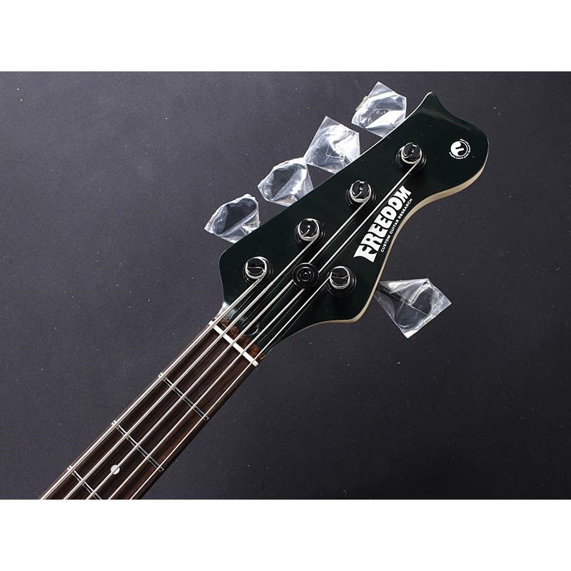 トラディショナルなアルダーボディ特有の、温かさのある中低域を基調とした弾力たっぷりなトーンを大きな音粒で、かつスピード感も備わる音質で出力しており、まさにワンランク上の旨みが存分に体感できるベースに仕上がっています。また、本機は新たにリアピックアップにオプション仕様のPBピックアップを搭載しており、両ピックアップ併用のバランスの良いサウンドは勿論、各ピックアップ単体で使用しても成り立つPBサウンドが新たなイマジネーションを駆り立てます。殊更、リアPB単体でのサウンド仕上がりが秀逸で、MMピックアップの様な力強さ、Jピックアップの様なセンシティブさを備えつつも、PBマイクならではの太くファットな音像、パンチたっぷりなアタック感を実現しており、リア単体特有の線の細さを感じさせない絶妙な塩梅でのサウンド創出を実現しています。他弦との音のバランスもきちんと取れたローBの鳴りも、さすがフリーダムと感じさせるポイントです。卒の無いプレイアビリティと質の高いサウンドを両立させる、当工房ベースの醍醐味がおおいに詰まった一本を是非、ご堪能ください。