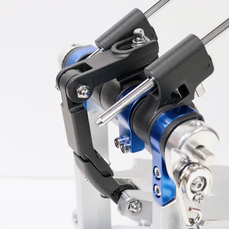 高精度に加工された青いパーツを、ボールベアリング挿入部分パーツとして採用。その青いパーツと平面加工処理が施されたフレームを組み合わせることで、ボールベアリングが内蔵された青色パーツを精度高く配置。ロッカーシャフトを精度よくまっすぐに配置することで、ボールベアリングのガタツキを防止し、円滑な稼動を実現。細部の精度を徹底追求しボールベアリングとロッカーシャフトのよりスムースな回転を可能としました。様々な奏法のフットペダルワークに正確に反応し、ドラマーの演奏を強力にサポートします。