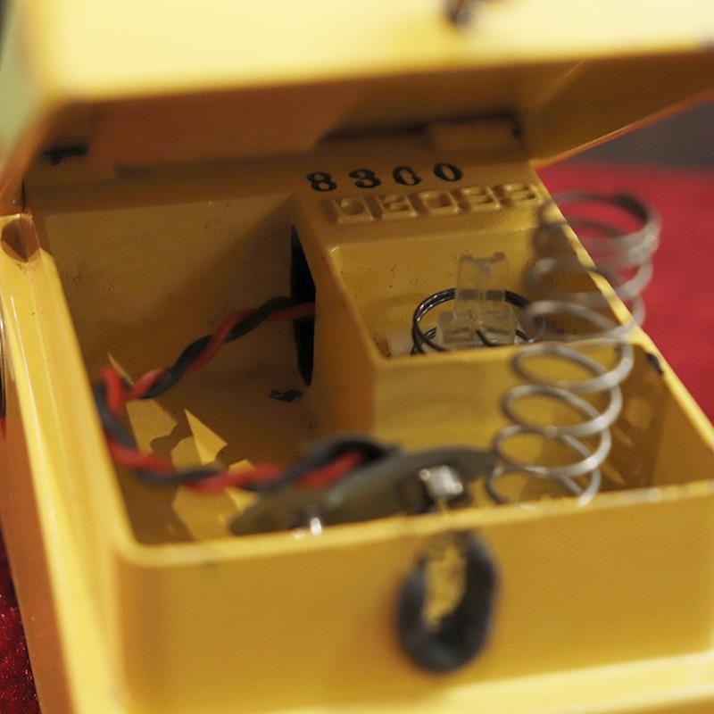 こちらは1979年頃に出荷された『OD-1』です。モデル名の全角ダッシュ、銀ねじ、スケルトンスイッチパーツという特徴を持つ1台。筐体に少々のキズや使用感がみられ、年式を考えるときれいなコンディションではないでしょうか。LEDライトの店頭は少し弱く感じられます。ペダルガイドブッシュ(止めねじ部分のゴム)の劣化がみられます。