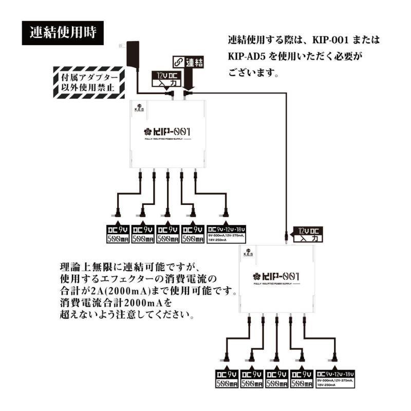 KIP-001は高電圧、低損失、かつ構造上筐体上面を放熱板として設計している為、高負荷時の熱変換量が大きく、大きな負荷をかけた状態で稼働させた場合、筐体上面はかなりの温度に達しますが、製品不具合ではございません。またKIP-001はフルアイソレートになっている為、カレントダブラーやデイジーチェインケーブル等を使って1000mA消費電流対応も可能ですが、上記同様に筐体上面が熱を持つ事がございます。
