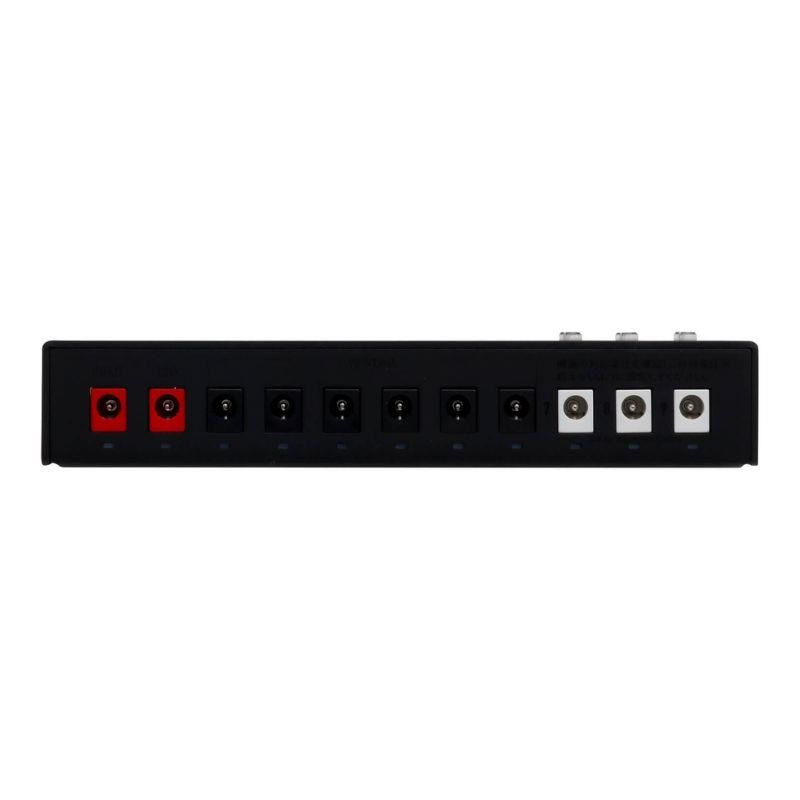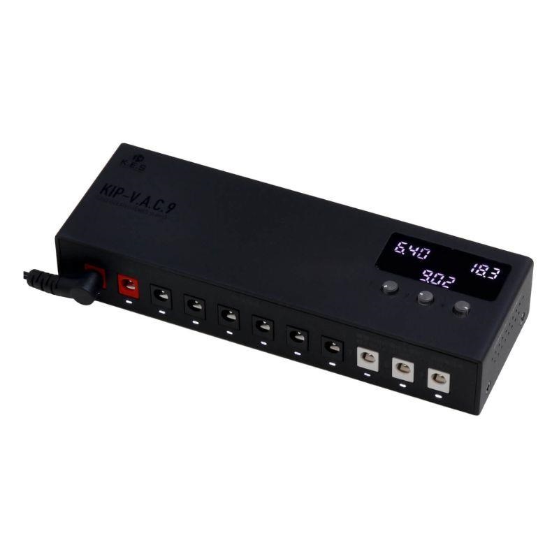 電圧をコントロール可能なボルテージアジャスト機能搭載のポートを3つ、無負荷時供給電圧を約9.8V(最適環境下において)のポートを6つの全9ポートを持つパワフルで高機能なパワーサプライです。グラウンドまで完全に個別にしたフルアイソレート回路です。Port1-6 は無負荷時供給電圧を約9.8V(最適環境下において)に、高負荷時でも9.4Vを確保出来るよう設定。特にDistortionやOverdrive系のペダルで音に張りと厚みが生まれ、ブライトネスも上がる効果も期待できます。ボルテージアジャスト機能により6.5V~18V 間を無段階で 任意の電圧に設定可能 (Port7-9)(電流も可変となります。目安として12V時 375mA 18V 250mA)。また、ボルテージインジケーターにより設定電圧を見える化。これらの機能により電圧が低めの電池をわざわざ用意して行っていたFUZZへの低電圧供給も持続可能になりました。小型のファンを搭載し、サイドから空気を取り込むことで冷却性能を飛躍的に向上させました。熱損失を最大限に減らして電力効率の上昇を実現(最大出力27W※)しました。