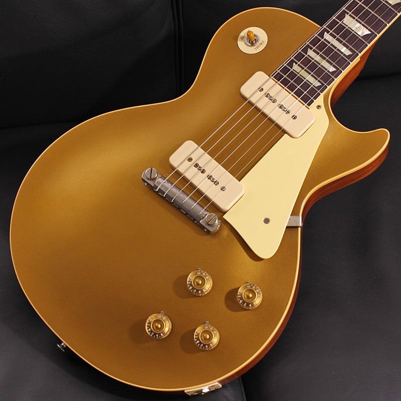 Goldの色味はDouble Goldと名づけられたカラーがフィニッシュされており、見る角度、光の当たり具合によって、渋さのある深緑から、明るいグリーン系のゴールドの色合いまで変化が楽しめます。P90ピックアップはフルサイズのハムバッカーよりもすっきりとしたシルエットになりますのでボディのトップカーブをより一層艶かしく見せてくれます。勿論、ハードウェアーやプラスチックのパーツ類は他モデル同様にTrue Historicパーツが採用されておりますのでオールドテイストの魅力を引き立てています。