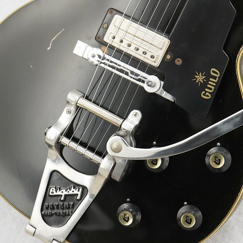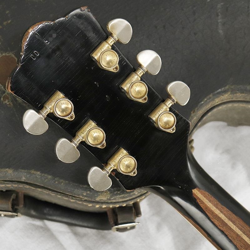 全体重量は約3.0kg。ボディ材はメイプルの中空構造。ブラックカラーにボディトップ/バックのバインディングで引き締まった印象を与えてくれます。現在は通常の木製ブリッジ/GテールピースからビグスビーB-7トレモロユニットに交換済みとなります(オリジナルパーツも残っています)。年式相応のウェザーチェック、塗装剥げ部分、打痕等キズ、ピックアップカバーのゴールドメッキの剥げ、金属パーツの錆びやくすみがみられ、ヴィンテージギターらしい素晴らしい雰囲気です。