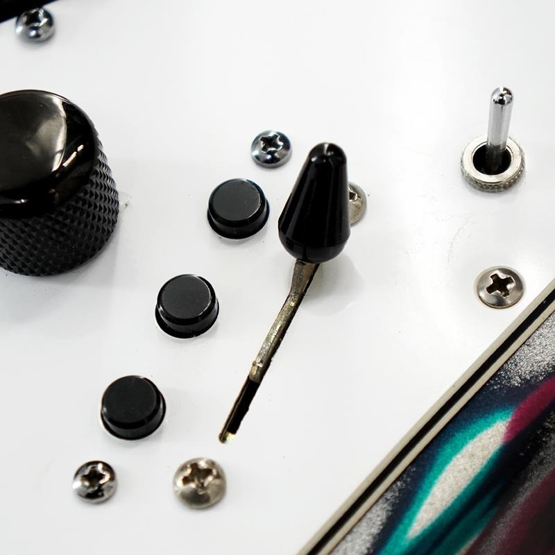 アッセンブリはボタンSWのSeries/Parallel SW仕様です。ダミーコイル(ノイズキャンセルコイル)がフロント/ センターのSingle Coil PUにそれぞれに搭載されており、そのダミーコイルを主PUに対して直列(Series)に接続するか、並列(Parallel)に繋ぐかの切り替えSWになっております。一番下のプッシュSWはリアHBの直列/ 並列(Series/Parallel)の切り替えになります。押すとSeriesになります。更に2Wayのリア・ダイレクトSWも搭載しておりますので、フロント/センターでバッキングトーンから瞬時にリア・ダイレクトのリードトーンをセレクト可能です!上にするとリア・ダイレクトのセレクトになります。