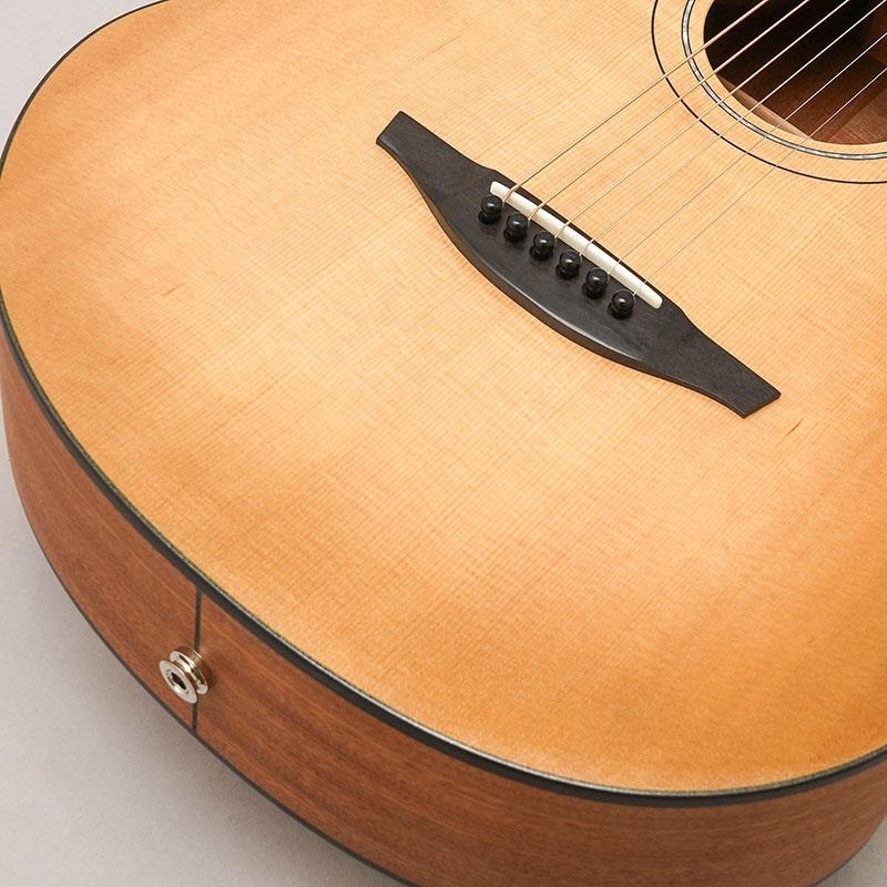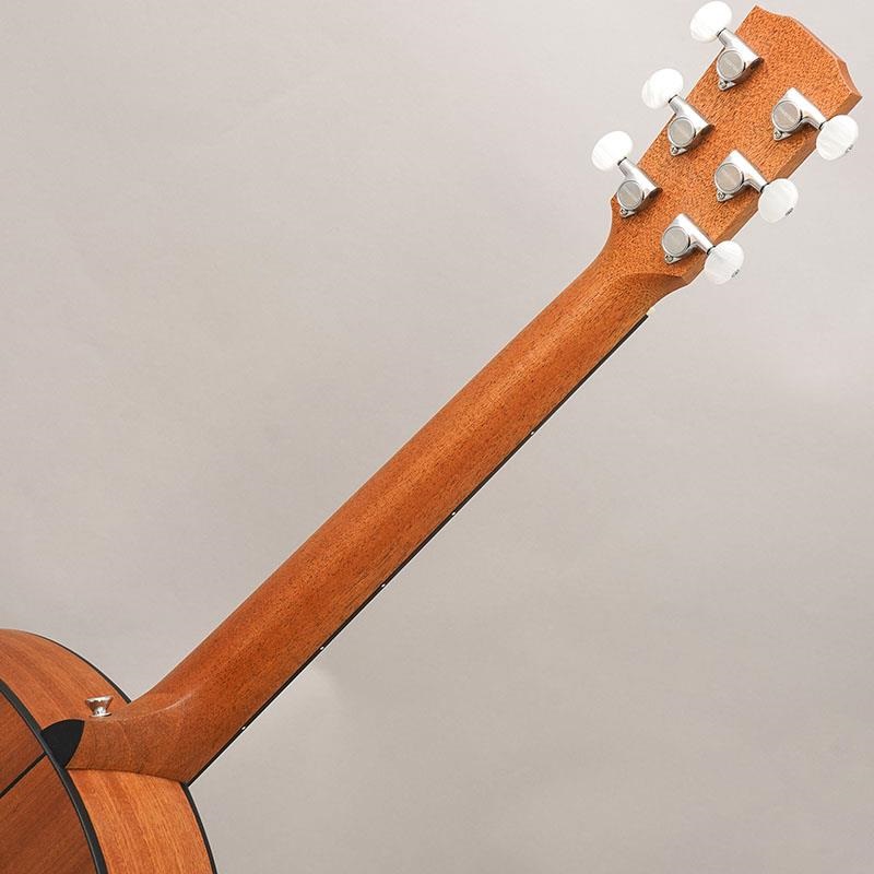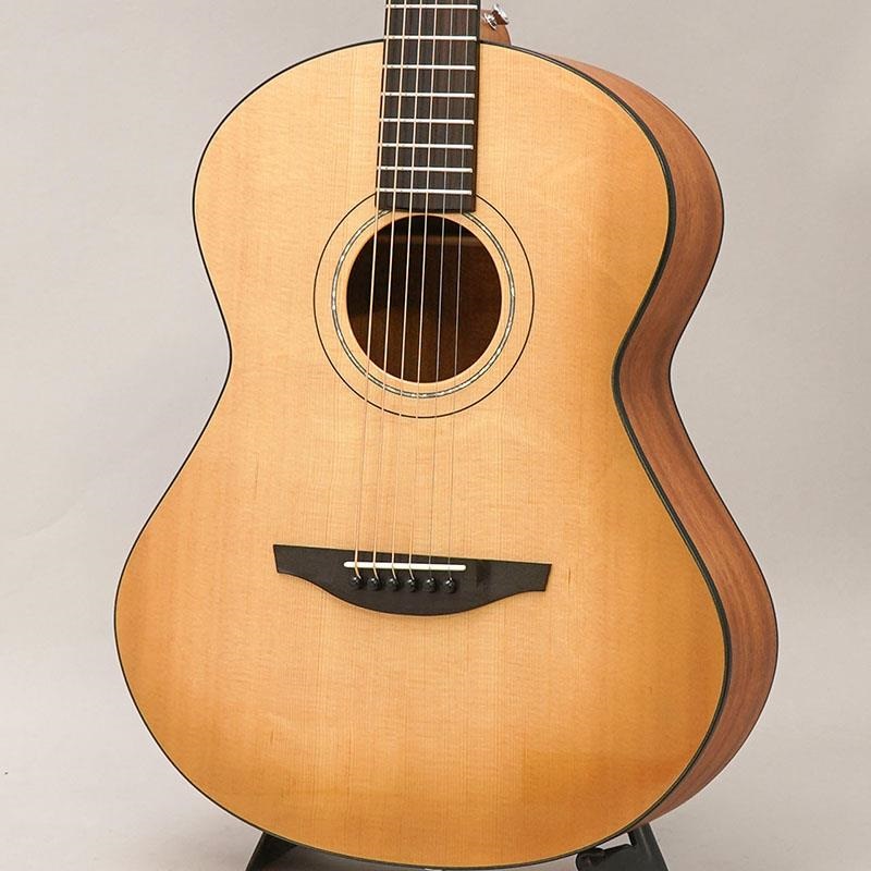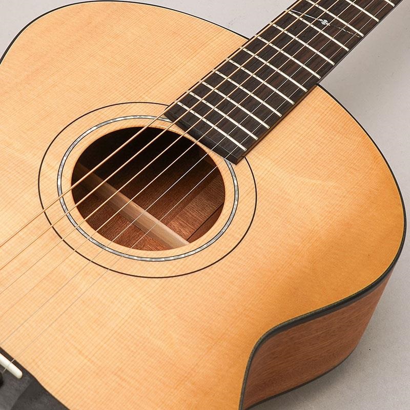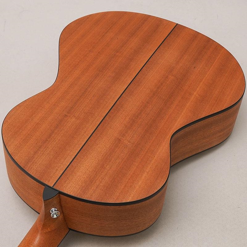 トップにはソリッド・スプルースを採用し、クリアで伸びのある高域と素直なレスポンスを実現。バック&サイドのマホガニーが温かみのある中低域を支え、小ぶりなボディながらバランスの取れた豊かな鳴りを生み出します。ネックもマホガニー、指板とブリッジには耐久性に優れたエボニーを使用し、安定したチューニングと確かな演奏性を確保しています。