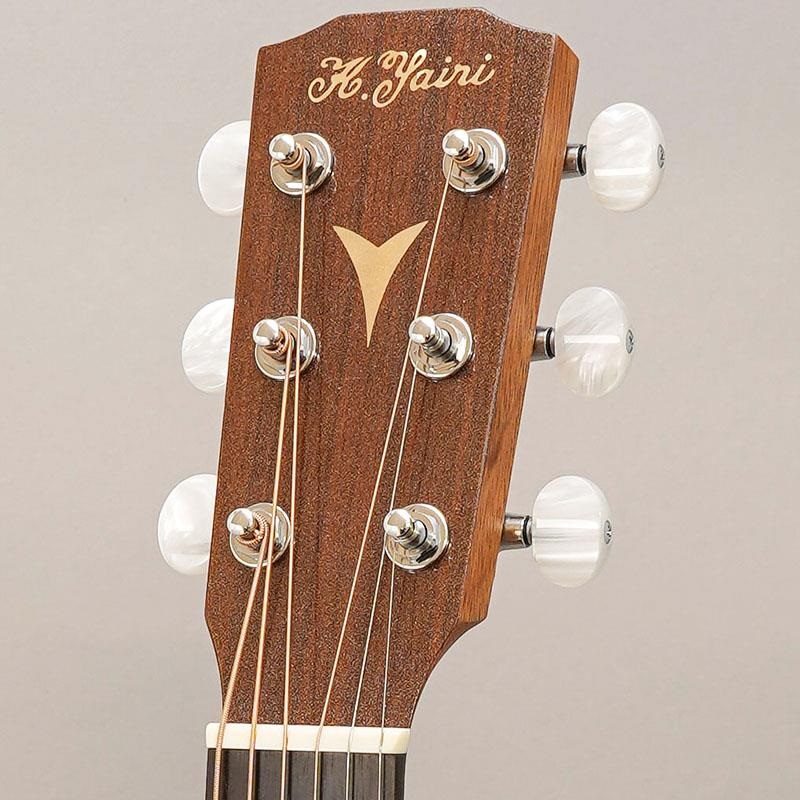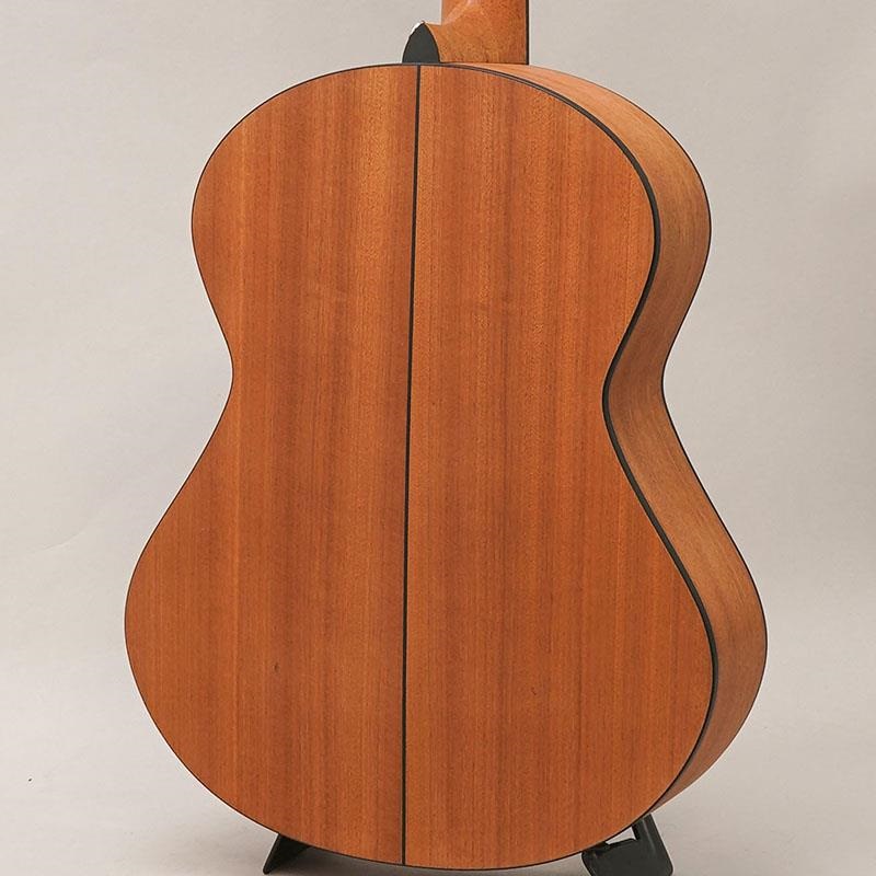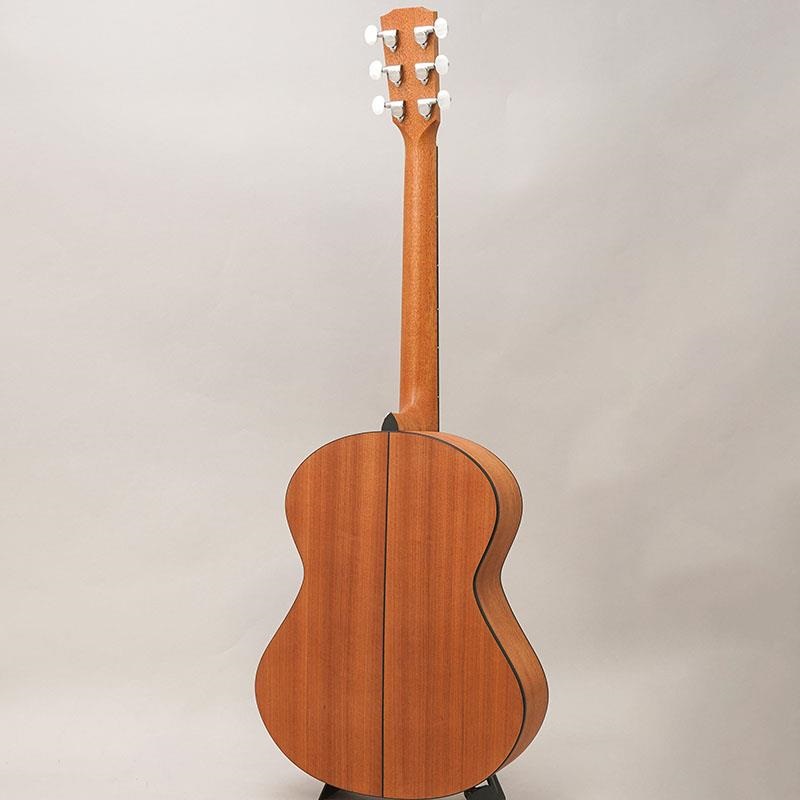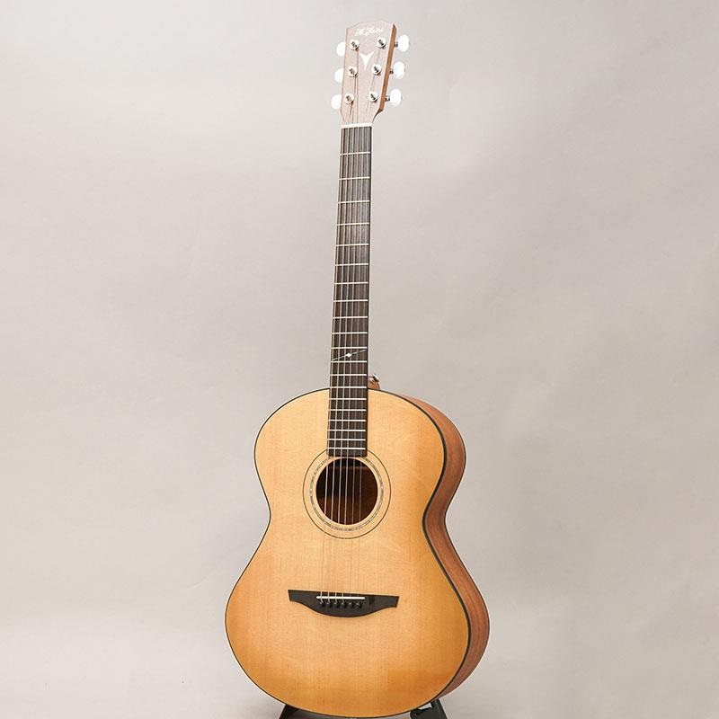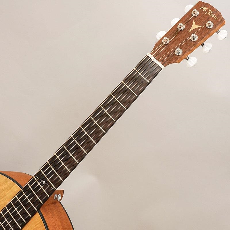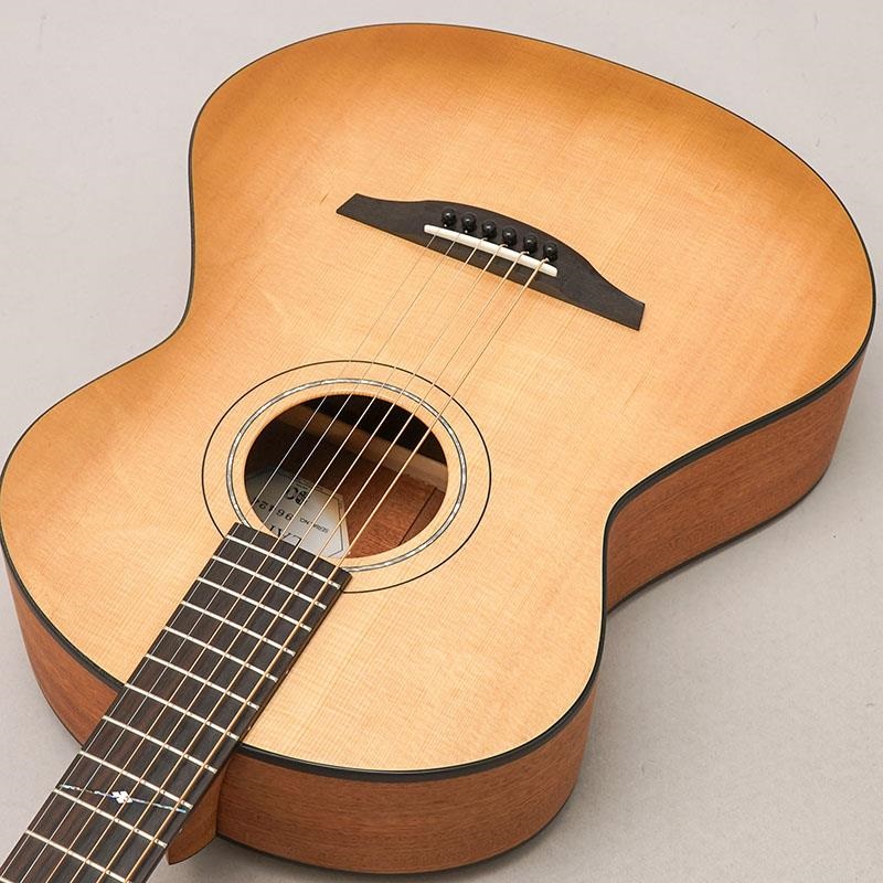 トップにはソリッド・スプルースを採用し、クリアで伸びのある高域と素直なレスポンスを実現。バック&サイドのマホガニーが温かみのある中低域を支え、小ぶりなボディながらバランスの取れた豊かな鳴りを生み出します。ネックもマホガニー、指板とブリッジには耐久性に優れたエボニーを使用し、安定したチューニングと確かな演奏性を確保しています。