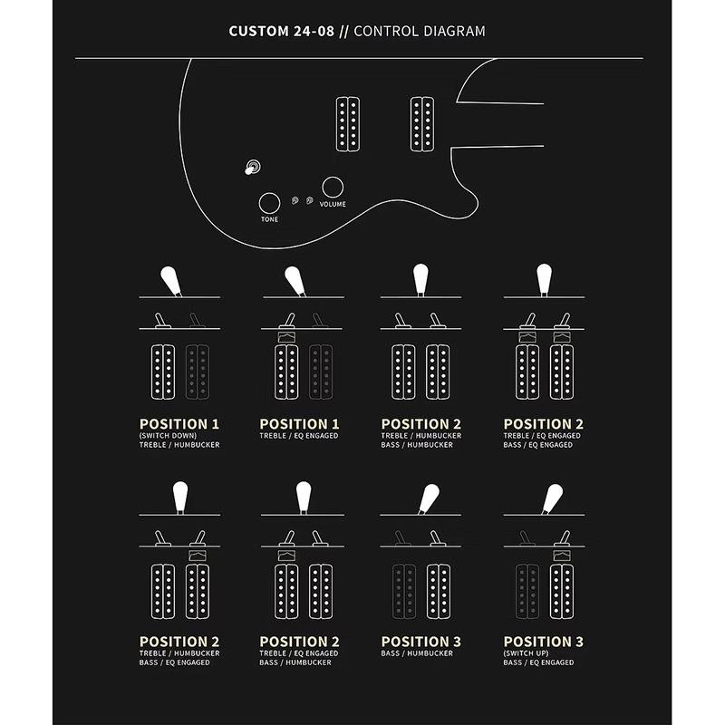 Controls : Volume & Tone Control w/ 3-Way Toggle Pickup Switch and Two EQ Mini-Toggle Switches