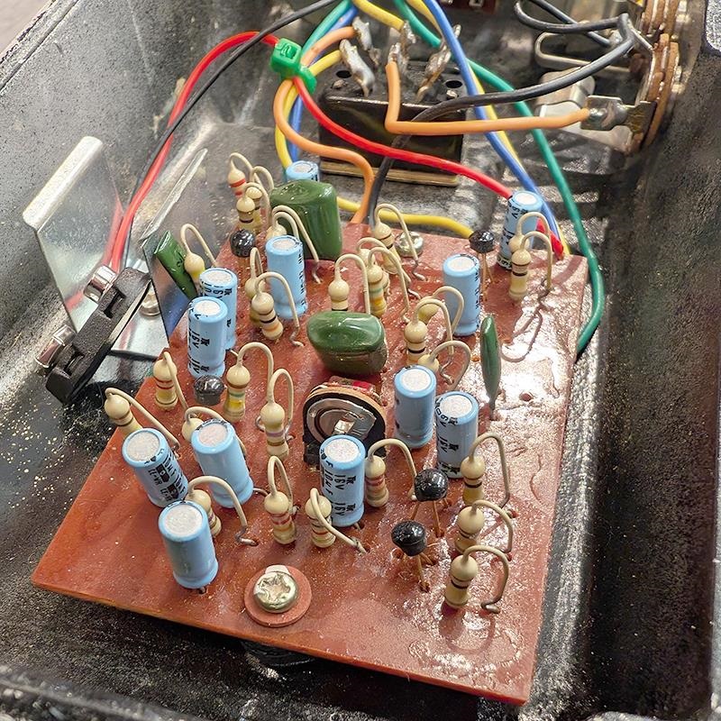 今回入荷はShin-ei製の後期仕様の1台となります。フットスイッチのゴムカバー劣化、筐体にキズがみられ、ヴィンテージ楽器らしい雰囲気の良いコンディションです。バッテリーボックス蓋、バッテリースナップ、トーン切り替えスイッチが交換済み。コントロールノブのメタルプレートは取れてしまっています。