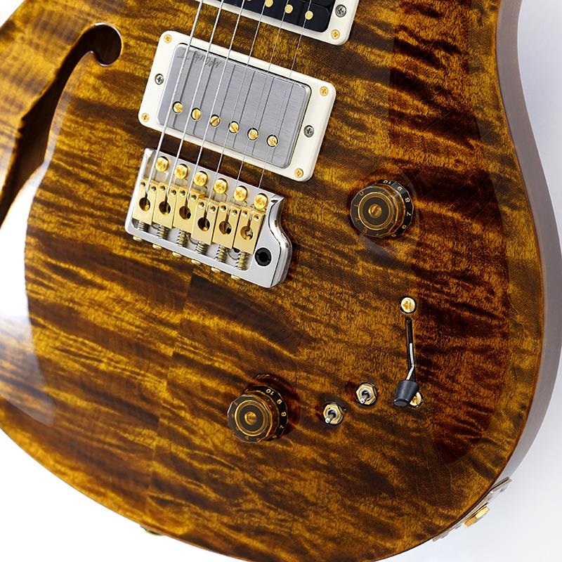 その他のスペックとしては、メイプル・トップ、マホガニー・バック、22フレット & 25インチ・スケールのマホガニー・ネック、ローズウッド指板を採用し、Phase IIIロッキング・チューナーとPRSオリジナル・デザインのGen IIIトレモロ・ユニットを搭載。ハムバッカーとシングル・コイルの音量差を抑えつつ、fホールを持つセミ・ホロウ・ボディ構造は、ギターのトーンに心地良い空気感と深みを与えます。