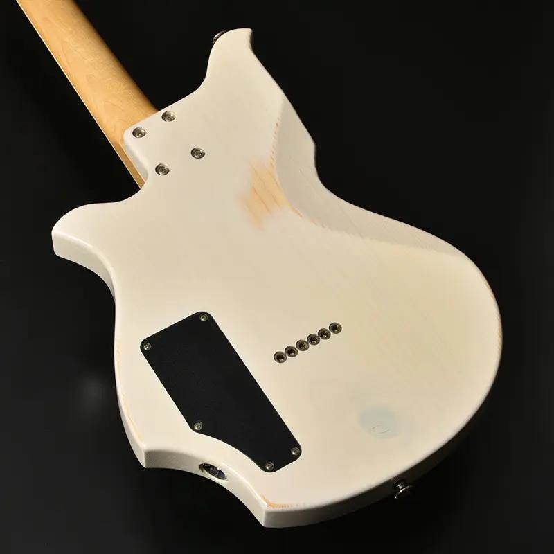 赤松の持つ節やシミを個性として捉え、全体的なデザインに馴染むようボディとヘッドストック、そして金属パーツにエイジド加工を施しています。