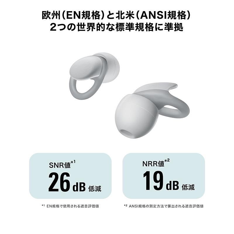 欧州(EN規格)と北米(ANSI規格)、2つの世界的な標準規格に準拠したイヤープラグ。聴覚保護具として安心してご使用いただけます。
