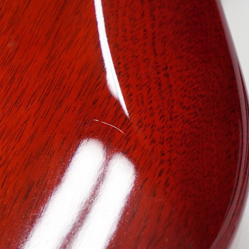 細かいスリキズや細かい打痕、塗装の元々からの小さいへこみ、塗装の引き、ボディバック全体の塗装ムラ、エンドピン部分の塗装のストラップ焼け。バインディング部分の幾つかの打痕、バックパネルのスリ傷、ピックアップカバーやパーツ類のくすみ等は見受けられますが、いずれもプレイアビリティに支障、問題ございません。全体的にもまずまずのコンディションです。当店にてフルメンテナンスとクリーニングを施しておりますので、すぐにご使用出来るお勧めコンディションの一本です。
