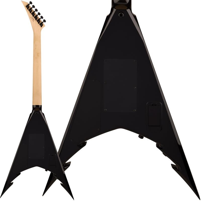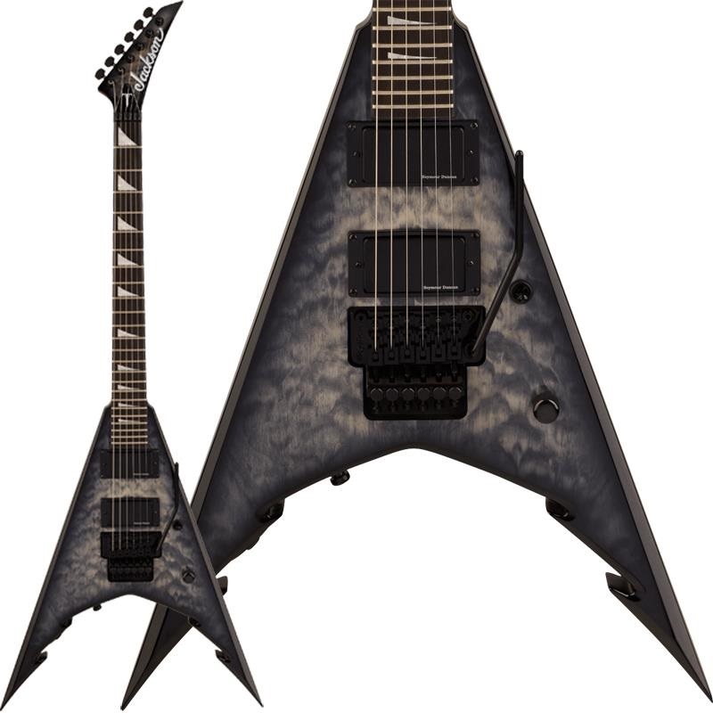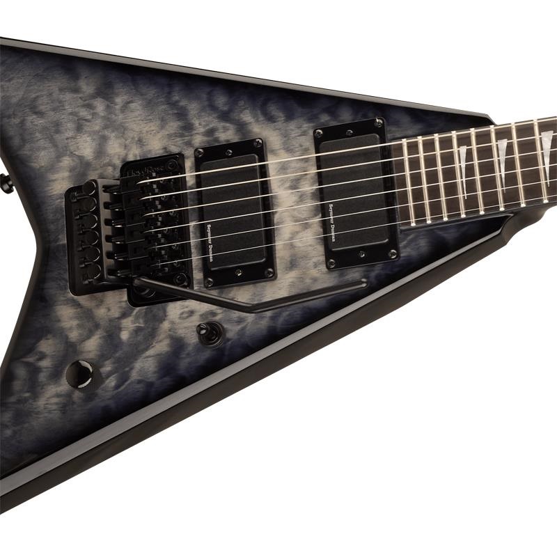 トランスブラックフィニッシュのPro Series Signature Corey Beaulieu King V KV6Qは、角度付きJackson6連ペグ式ポインティマッチングヘッド、ブラックのヘッドストックバインディング、ブラックハードウェアを備え、ステージで轟音を轟かせる準備が整っています。