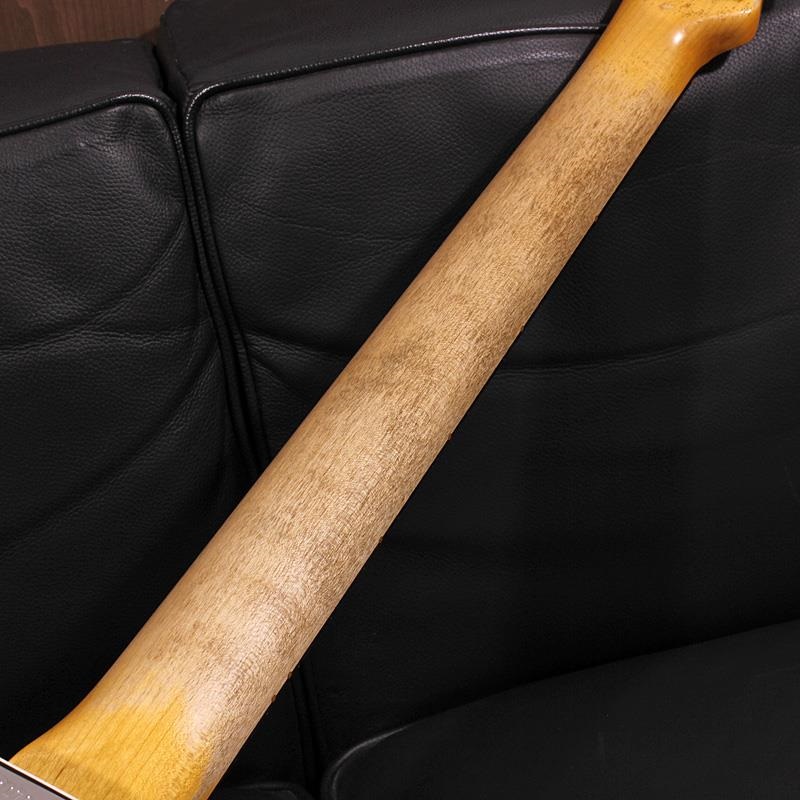 しっかりとした音の太さが感じられるミドルの効いたパンチある鳴りを生み出すアルダーボディを包むのは、Relic加による歴戦の使用感が表現されたスタイリッシュなブラックフィニッシュ。アルダーの導管も所々確認できるような極薄ラッカーフィニッシュの表面には適度な光沢が残されており、光を浴びてキラッと輝く姿が最高に格好良いです!Telecaster Custom(通称カスタムテレ)ならではのトップ&バック両面のバインディングにも細かなウェザーチェックが施されるなど、繊細な技術が垣間見れる点もさすがMBS製品!と感心させられますね。太く豊かに鳴りながらもガリンッと金属的でシャープにまとまるトーンはロックスタイルのギタープレイとの相性が特に良さそうです。
