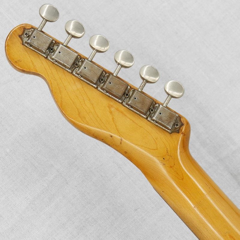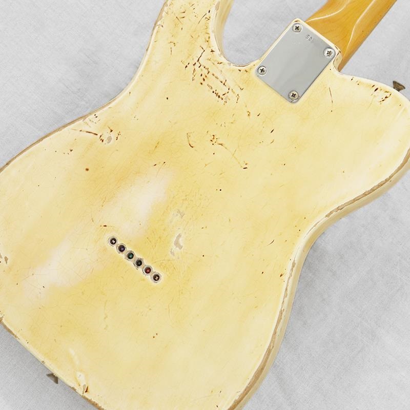 全体重量は約3.1kg。ボディ材はアッシュ。オリジナルのブロンドカラーにいちどいちどワインレッド系のオーバースプレーが施され、それを剥がしブロンドカラーに戻しています(オーバースプレー以前の打痕部分等にカラーの名残がございます)。ボディ厚は45.0mm台をしっかりキープしているのが嬉しいところです。ウェザーチェック、打痕等キズ、ピックガードの使用感、塗装の剥げ、金属パーツのくすみ等がみられ、ヴィンテージらしいとても良い雰囲気を醸し出しています。