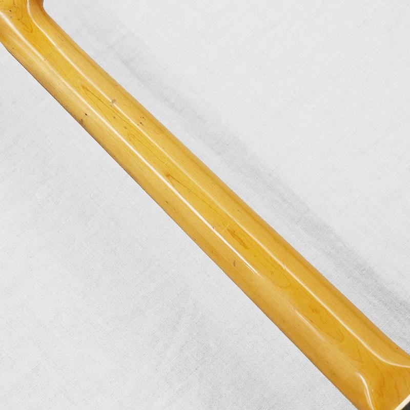 ネック材はメイプル。フィンガーボード材はスラブ貼り(平貼り)の素晴らしいローズウッドです。ヘッド部のデカールロゴはしっかり残っています。ネック裏に打痕や使用による塗装剥げ、金属パーツのくすみ等がみられますが、比較的きれいなコンディションといえるでしょう。チューナーはクルーソンデラックスのシングルライン、巻き具合にバラつきはみられますがしっかりと機能しています。フレット/ナットはいちど交換され、少々の減りはみられますがプレイアビリティは良好です。ヘッド厚13.7mm。ナット幅41.8mm。薄いローフレット付近からエンド方面に向けてがっしりしてくるネックシェイプとなります。