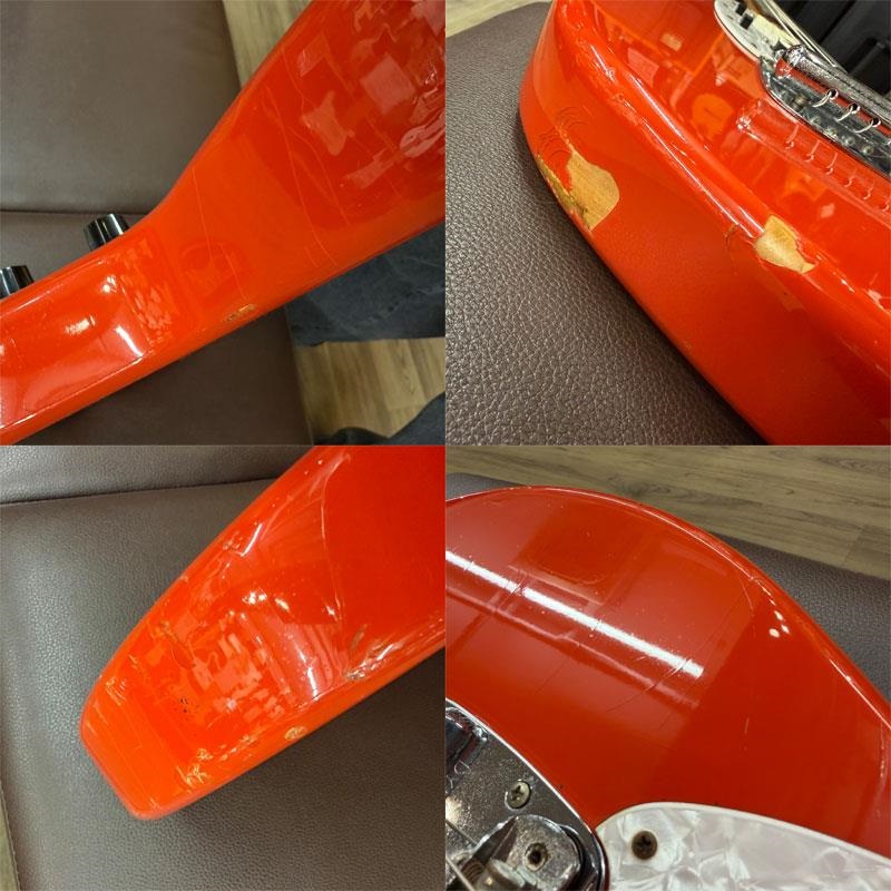 当個体状態といたしましては、ボディ下部の大きな塗装割れを始めとして、全体にクラック、スレキズ、弾きキズ、うち傷、ハードウェアパーツのくすみやさびが御座いますプレイヤーズコンディションとなっております。フレットは5~6割程度の高さを残し、トラスロッドがやや締め方向に固くなってきているものの、ネックコンディション、電装系含め演奏面で問題はございません!まだまだ末永くお付き合いいただける1本としてお迎えいただけます。この機会に是非ご検討ください!