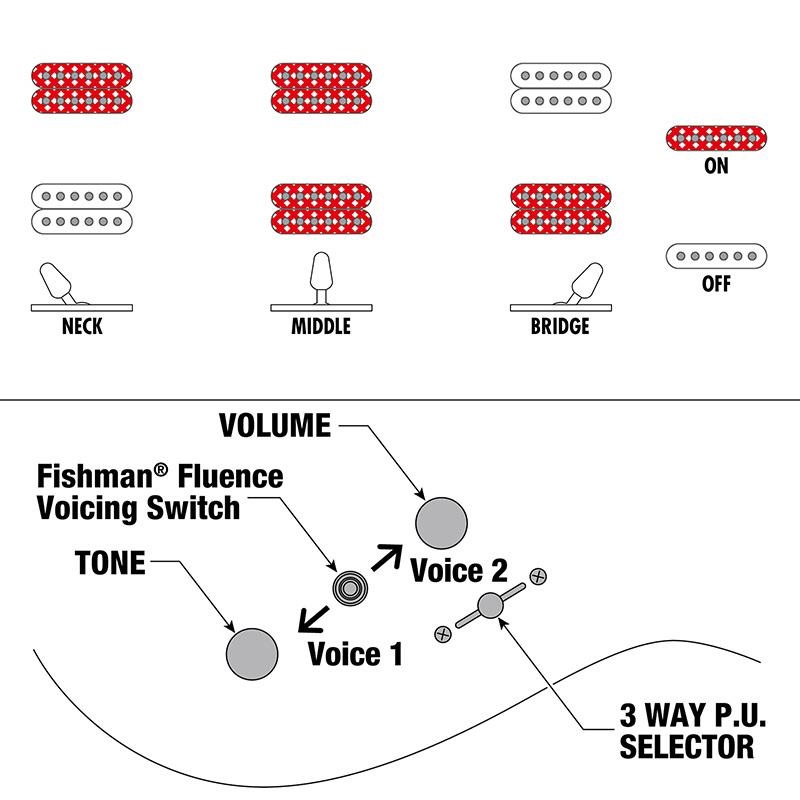 歯切れがよくひりつくようなクランチかつピュアでタイトなベースで現代的なうなりが特長のModern Active High Outputモード(Voice1)と、オーガニックかつ高出力なトーンで優れたディストーション・キャラクターとFluence ならではのダイナミクス、さらに反応の良さが特長のModern Passive Attackモード(Voice2)を選択可能なピックアップです。(006P電池使用)