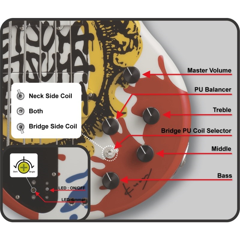 CONTROLS:(Front) Master Volume, PU Balancer, 3 Band EQ, 3Way Bridge Pickup Coil Tap Toggle / (Back) LED ON/OFF SW, LED dimmer