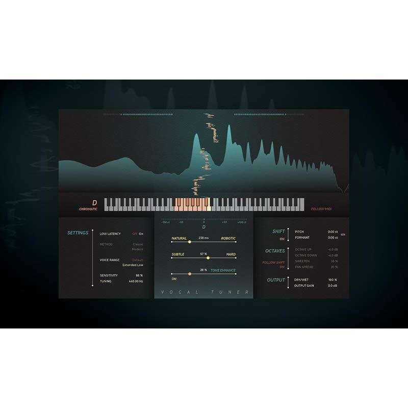 いくつかの簡単なダイヤルイン コントロールの背後には、ボーカルを微調整する機能があります (必要に応じてリアルタイムで)。または、完全なハード チューンを実行して、ピッチとフォルマントの移動、オクターブの上下、トーン エンハンス スライダーなどの多彩なエフェクトを追加することもできます。