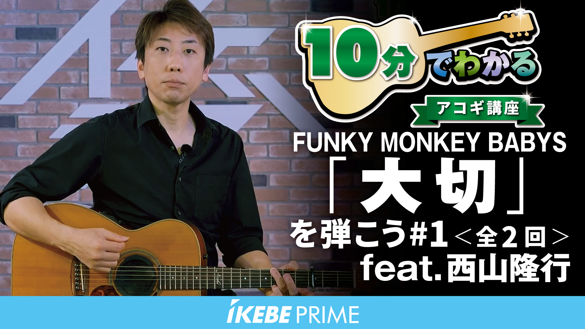 Ikebe PRIMEメンバー限定アコギレッスン動画で、初心者でも、この動画を見て練習すれば、誰もが一度は耳にしたことのある1曲を最後まで弾ける様に!■課題曲:FUNKY MONKEY BABYS「大切」2007年にリリースされた、身近な人への感謝や愛情をまっすぐに歌ったバラード「大切」。温かく力強い歌詞とポジティブなメロディが特徴で、聴く人の心に優しく寄り添います。ジャケットには俳優・佐藤隆太が登場し、その笑顔とともに「人を想う大切さ」を象徴する、ファンに愛される代表曲の一つです。■レッスンポイントこの曲ではカポタストを3フレット(3番目の位置)に装着して練習しましょう。第1回目の今回は「イントロ」と「Aメロ」を解説します。→ Aメロの8小節目は力強く演奏しよう→ Aメロの13小節目はカウントを数えよう■講師情報:西山隆行「ミスター・ギター」と称される巨匠チェット・アトキンスの記念年次大会に日本人として初参加。N.Y.の名門ライブハウス「ザ・ビター・エンド」にも出演。オーストラリアのNo.1ギターメーカーMaton Guitarsのデモンストレーターや、"ゆず"の楽曲でギターのアレンジやレコーディングを担当。