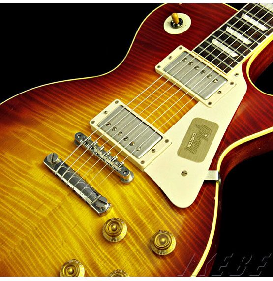 続いてEdwin Wilson氏が手にしている、深いチェリーカラーを残しつつもわずかな退色が見られるボディトップカラーに極上ワイドフレイムが眩しい一本は、Collector’s Choice #9 Vic DaPra 1959 Les Paul。世界で三本の指に入るバーストコレクターVic DaPra氏が所有するシリアルナンバー「9-0850」のオリジナルバーストを再現しています。