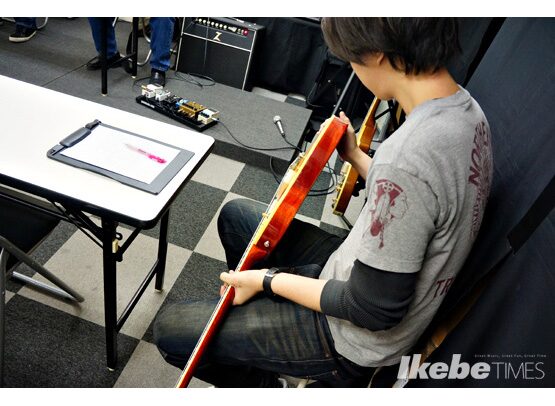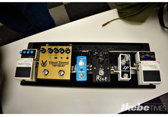 こちらはThom Fowle氏のエフェクトボード。シンプルながらツボを押さえたセレクトはさすがです。このボードの裏には電源バッテリーも搭載されていました。MOOER Pitch Boxはうっすらとデチューンさせるために使用。アンプはギターズステーション店頭のDr.Zを使用して、素晴らしいギブソンサウンドを奏でて頂きました。