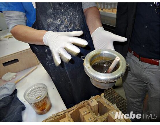 2014年のヒストリリック・コレクションNEWスペックとして、2013年のネックジョイントに続き新たに指板接着にも採用されたハイドグルー(にかわ)。毎朝、その日に使用するハイドグルーを調合します。一日に平均60本程が作業されます。