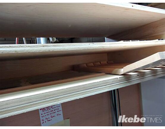 接着を行う際に、その日行うネック材&指板材を、作業台の上の棚に並べられます。こちらも木材が温められる構造となっており、より迅速な作業が求められます。