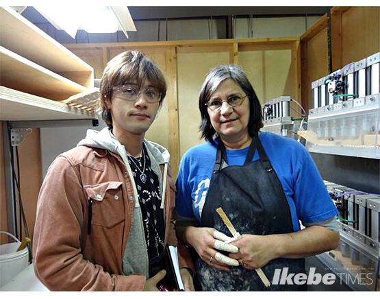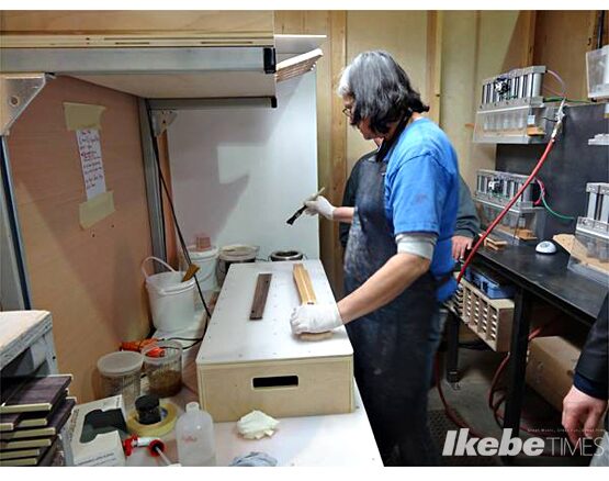 指板接着の作業を担当しているキャシー・ベイカーさん。とても丁寧な説明をして下さいました。