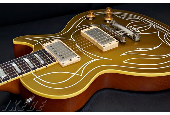 50年代ごろからカスタムカーやバイクに施されていた装飾、ピンストライプ。Billy Gibbons Les Paul Goldtopは、トレーニング・クラスによりピンストライプのスキルを習得したEdwinチームのスタッフ1名と、社外のスタッフ2名による手書きで仕上げられております。