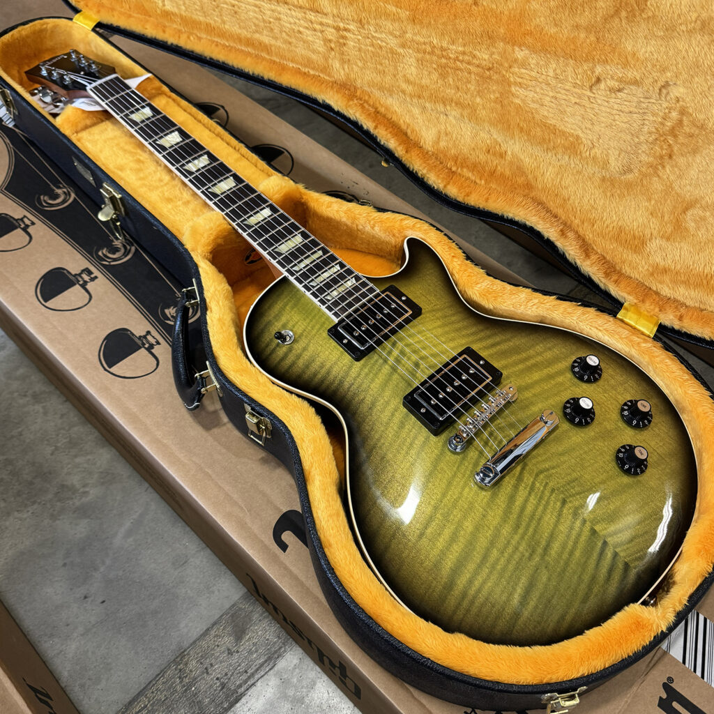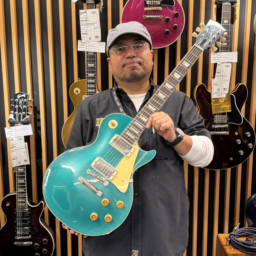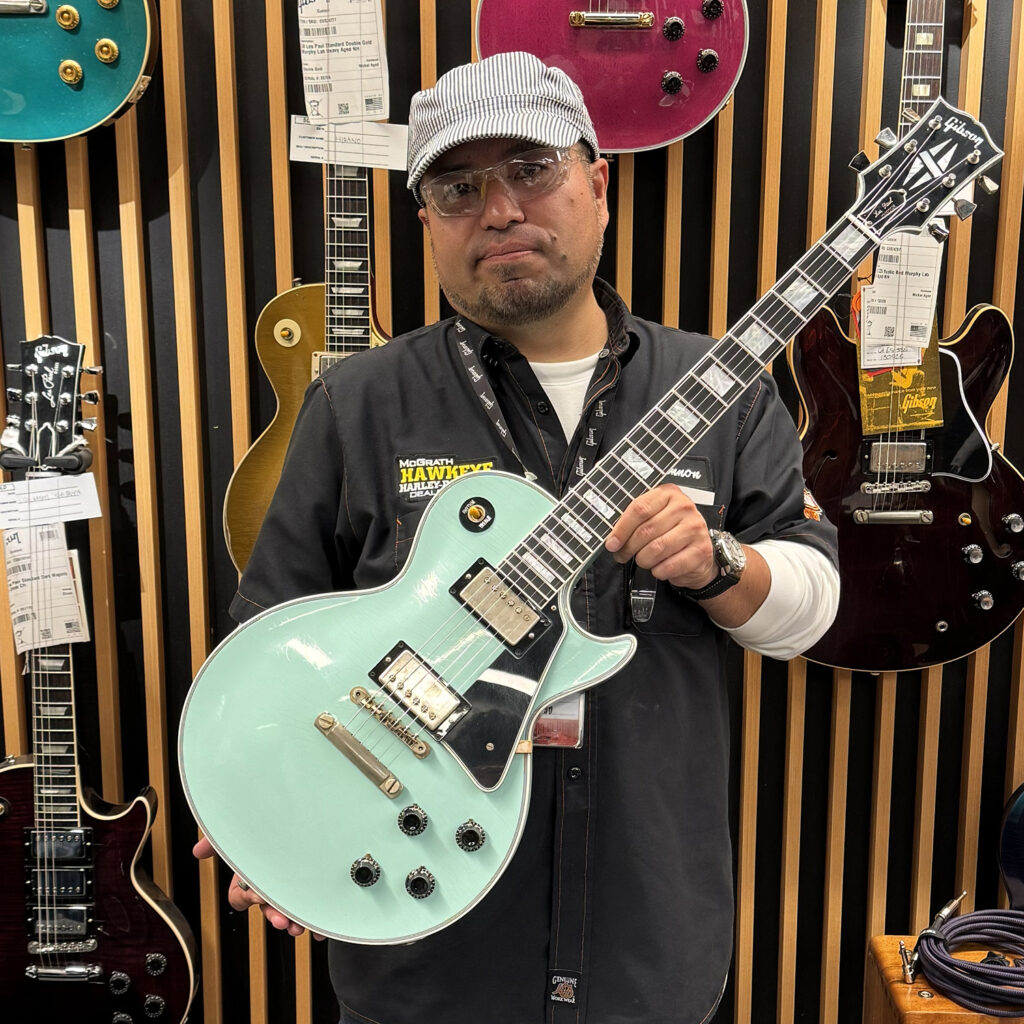 メタリック・シー・グリーンと名付けられたカラーがステージに華を添える1本!サウンドチェックはできていませんが、ベースモデルが59レスポールのためサウンドはもちろん最上級!(のハズ!)カラーの下には美しいフィギュアが入っているのかもしれませんね…。